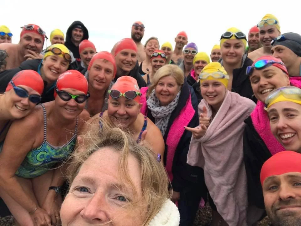 Pre-swim group selfie - that's me looking nervous in the bottom right hand corner, and Emma France who now runs the group in the foreground.